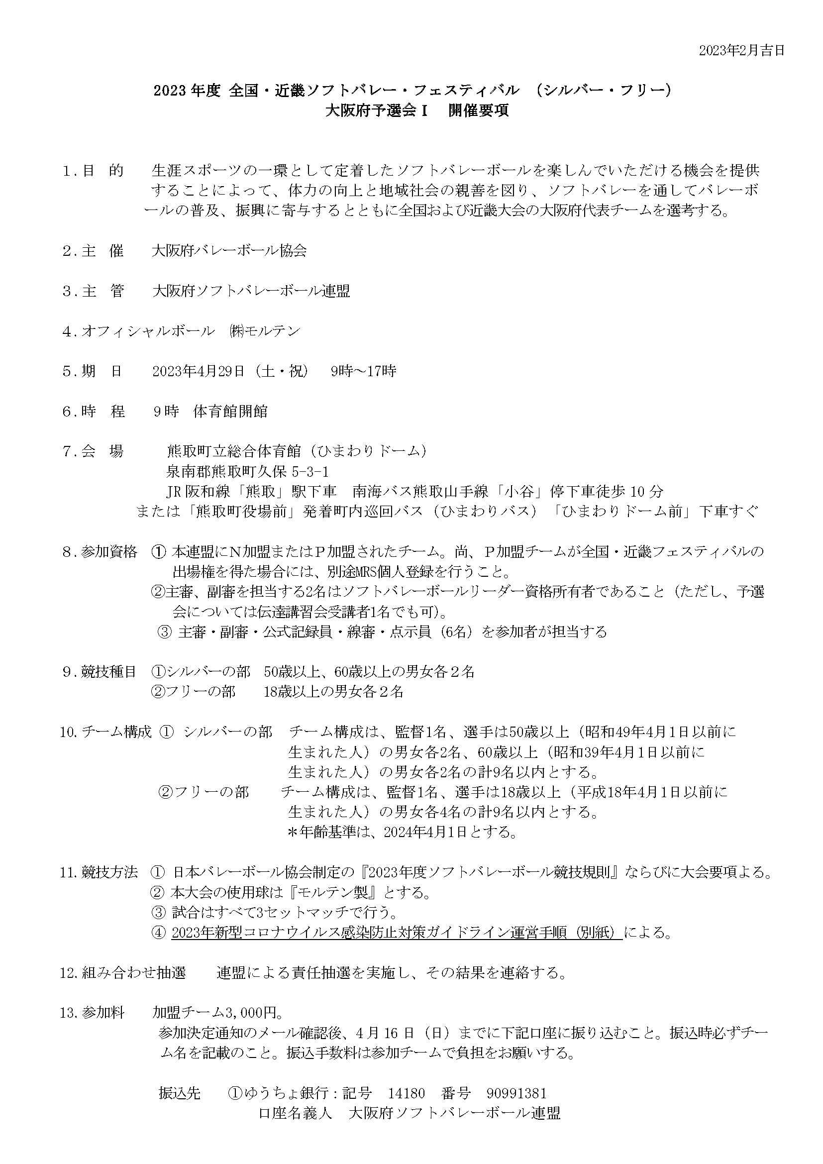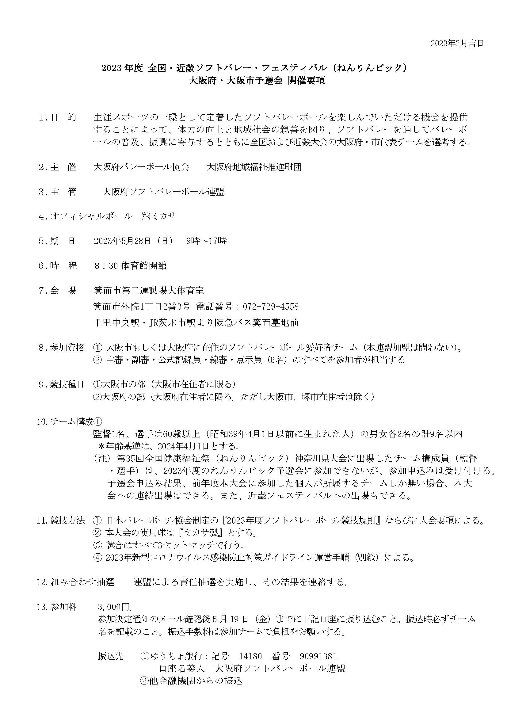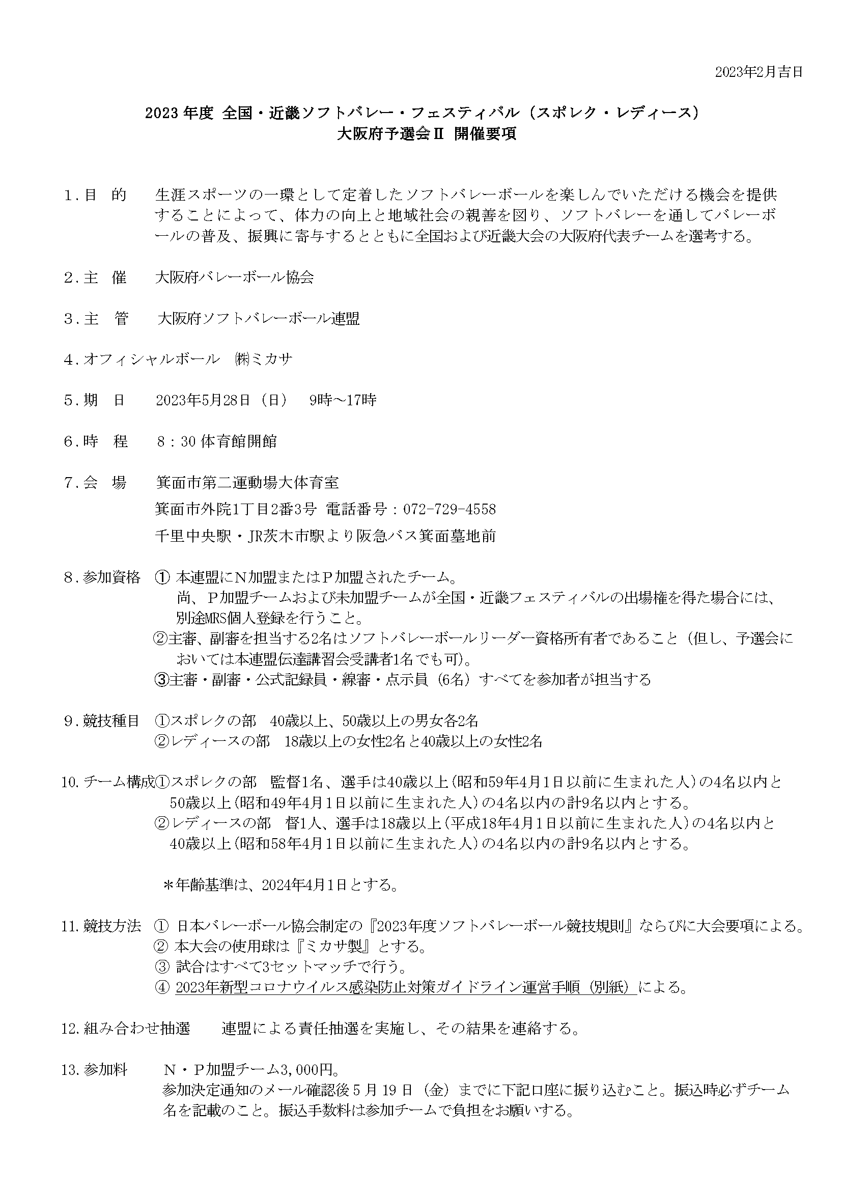 | 全国・近畿ソフトバレーフェスティバル府予選会Ⅱ・北大阪交流会 | 2024年5月26日(日)要項書・